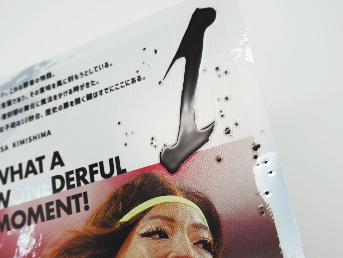 たとえば、こちらの事例。数字の「1」に加工を施しました。まるで液体がその場に留まっているかのような、瑞々しい光沢と立体感が見て取れます。デジタルバーコ印刷は、こうした「濡れたようなツヤ(ウェット感)」を出すのが得意です。