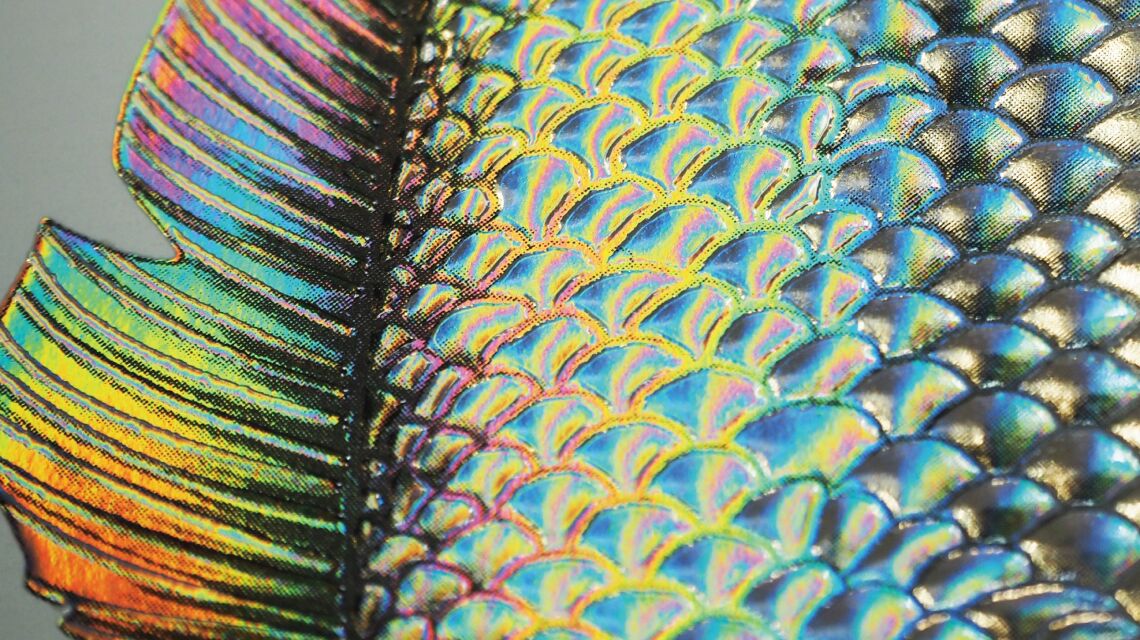 最後はこちらの魚のイラスト。鱗の一つひとつに盛り上がりを持たせることで、生物特有の生々しい質感を再現しています。 カラー印刷のグラデーションと、盛り上げのハイライトが重なることで、擬似的ながらもリアルな物質感が生まれます。