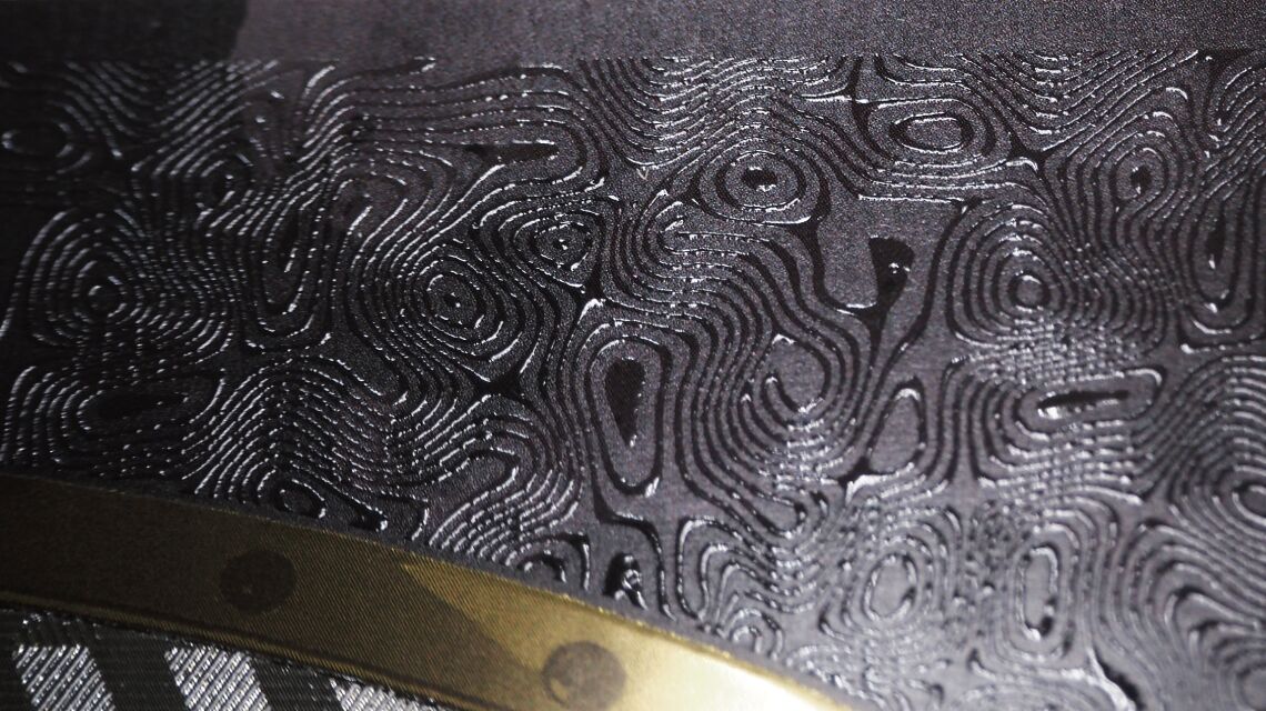大胆な盛り上げだけでなく、こうした繊細なパターンの表現も可能です。 濃い色の印刷面にクリア(透明)な樹脂を乗せることで、光の加減によって模様が浮き出たり消えたりする、シックな見せ方ができます。