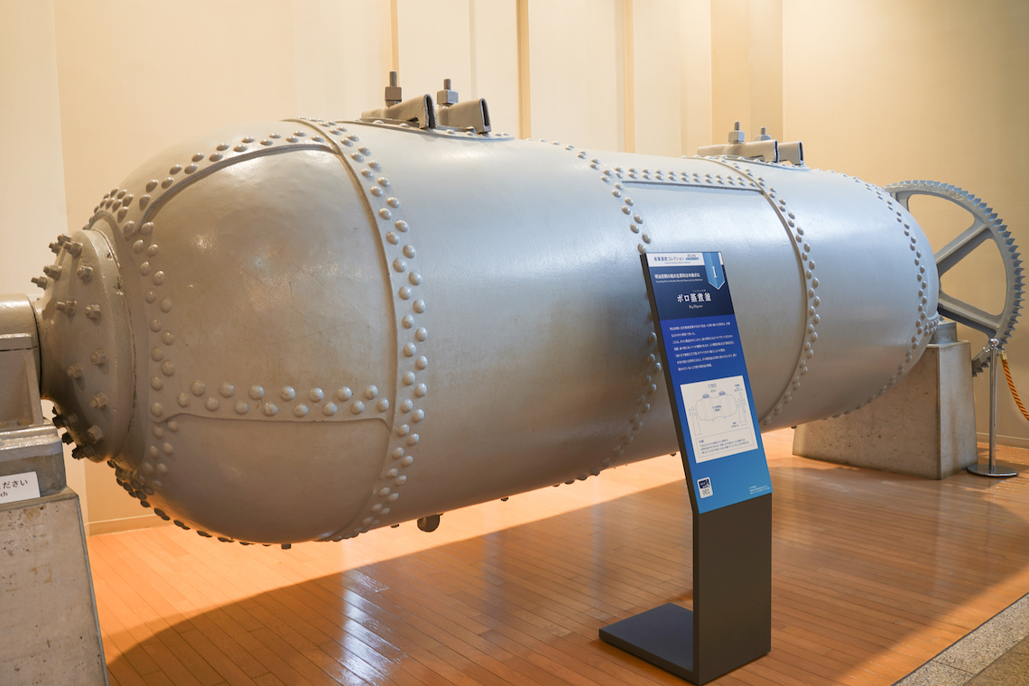 展示室入口脇には、早速大型の展示物が。こちらは木材ではなくボロ布から紙の原料であるパルプを作るための「ボロ蒸煮釜」。貴重な現存品です。