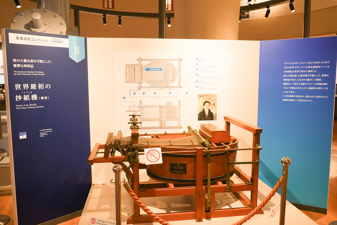 入口で目を引くのは、紙の大量生産を可能にした重要な発明品、世界最初の「抄紙機(しょうしき)」の模型です。普段私たちが何気なく使っている紙が、いかに先人の工夫や知恵で生産されているのかを視覚的に理解することができます。印刷会社に勤める身としても、印刷機に通される前の「紙が広く使われていく瞬間」を感じられ、非常に見応えがありました。