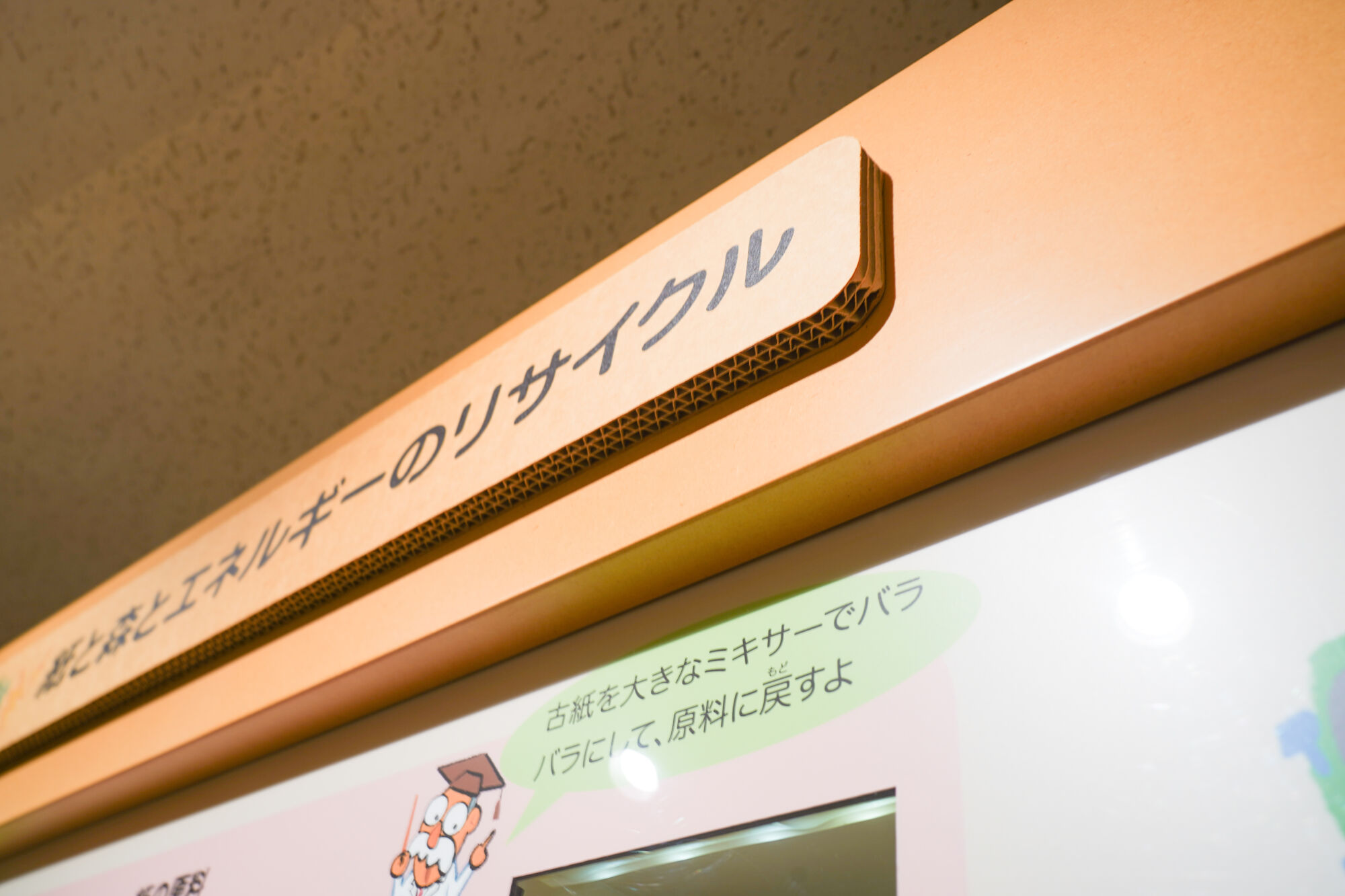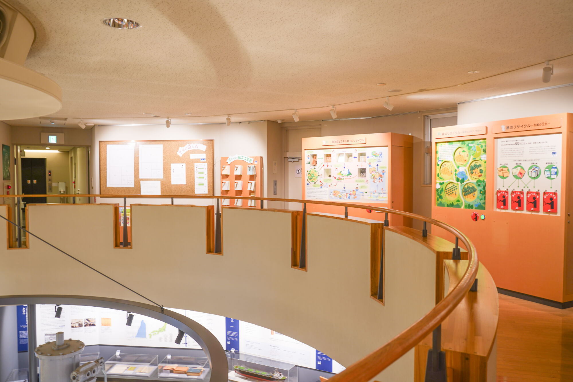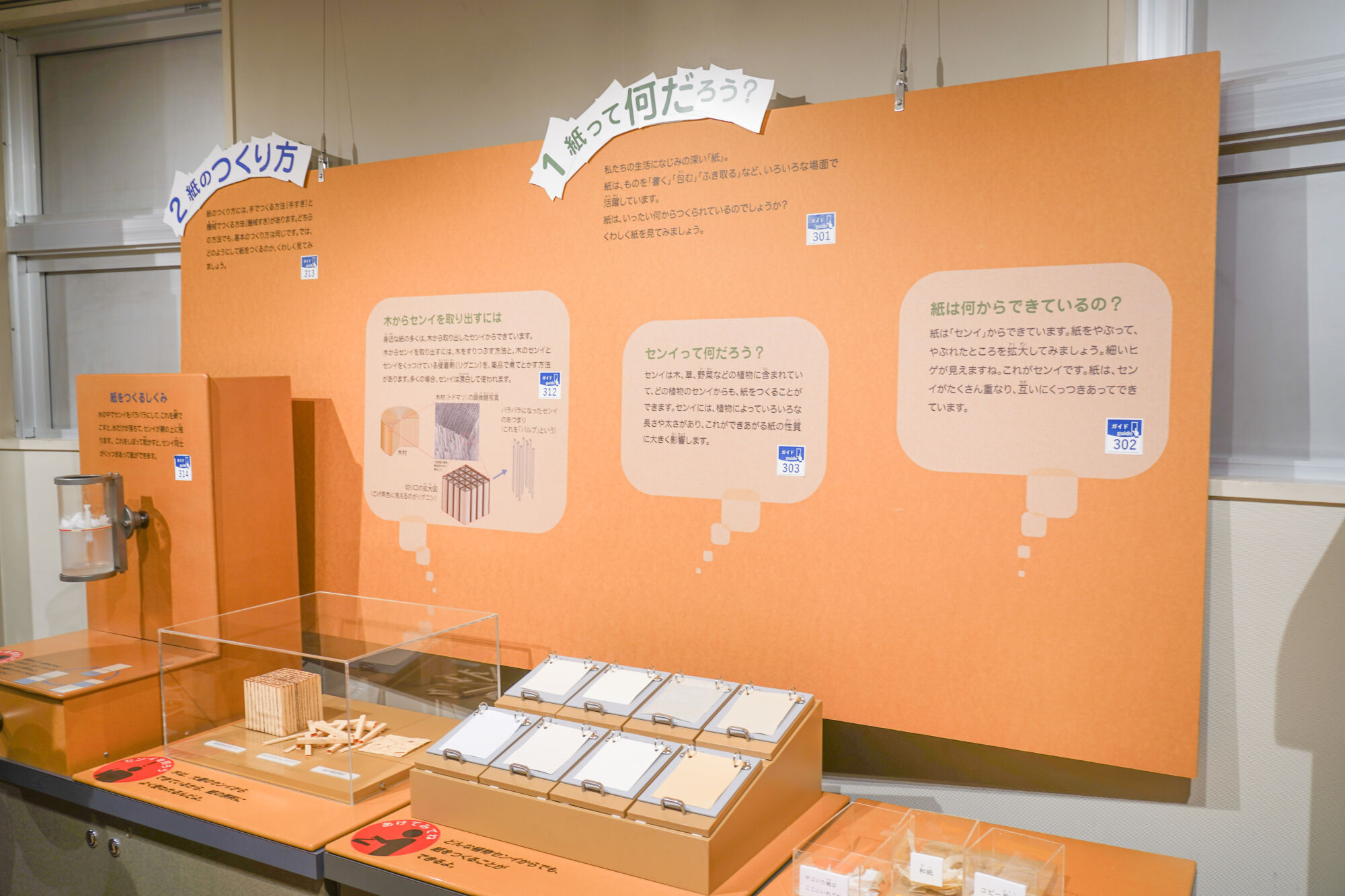 ここでは、紙の原料となる木材や植物の種類、そして紙ができるまでの製造工程が、パネルや実物サンプルを使って非常に分かりやすく解説されています。
