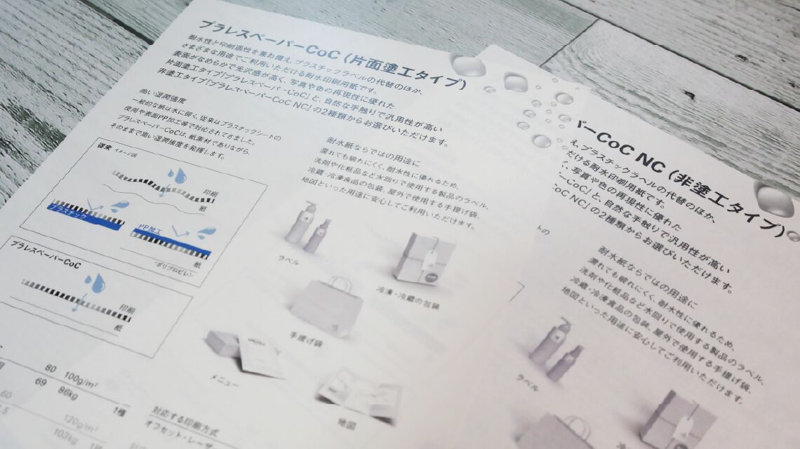 プラレスペーパーCoCは、プラスチックフィルムの代替を目指して開発された「耐水印刷用紙」で片面塗工タイプの紙です。樹脂フィルムを使わず、木材パルプ100%でありながら、特殊な耐水加工によって「濡れても破れにくい」強さを実現しています。また、非塗工タイプのプラレスペーパーCoC NCもあります。