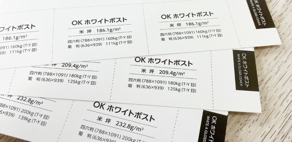 さらに、OKホワイトポストは表面の平滑性が非常に高く、インキが均一に乗るため、印刷の仕上がりが安定していることも特徴です。光沢感のある滑らかな面は、細かなグラデーションや繊細な色表現をムラなく再現でき、写真やイラストをより一層美しく際立たせます。