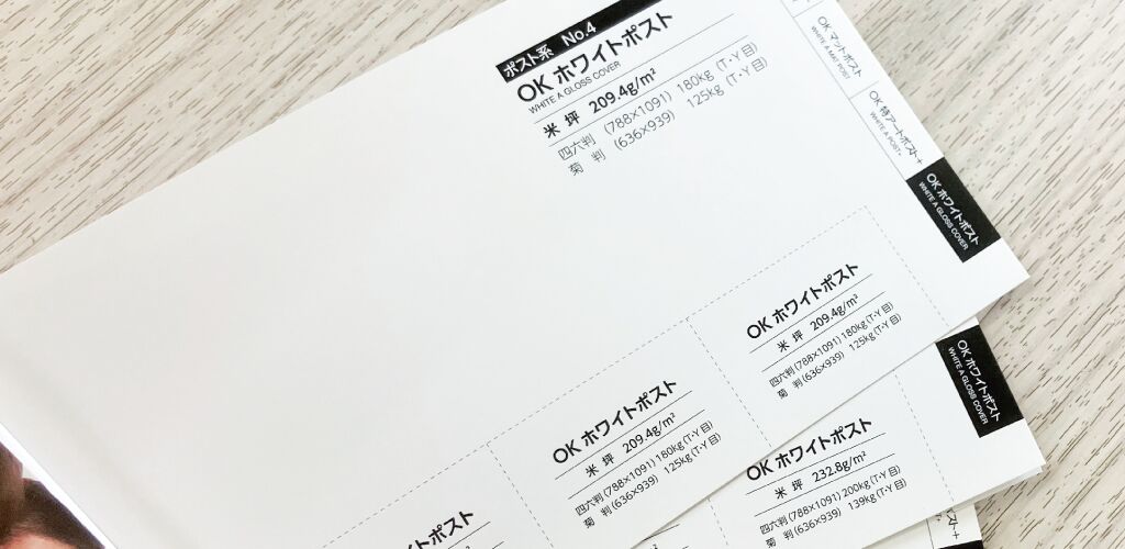 そもそもアートポスト紙とは、表面にコート紙のような光沢を持ちながら、ポストカードのようにしっかりとした厚みを備えた紙のことを指します。四六判で160kg〜240kgまでの幅があり、用途に応じて選べるのが特徴です。厚みと高級感を両立したい場合には、間違いなく候補の一つになる用紙です。