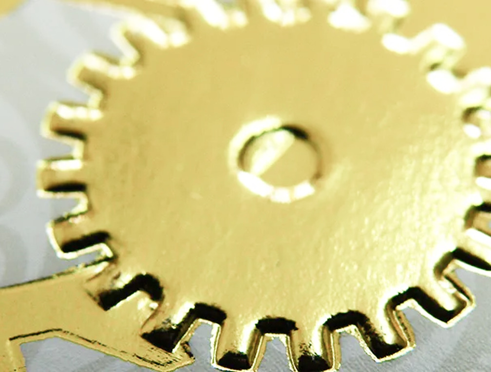 まず、転写させたいオリジナルのロゴや絵柄の金型(箔押し用の版)を作ります。金型と印刷物の間に箔を敷き、金型を上から押し込みます。その際、約170度の高温の熱と圧力をかけることで、印刷物に箔が熱転写されていく加工方法が“箔押し印刷”です。