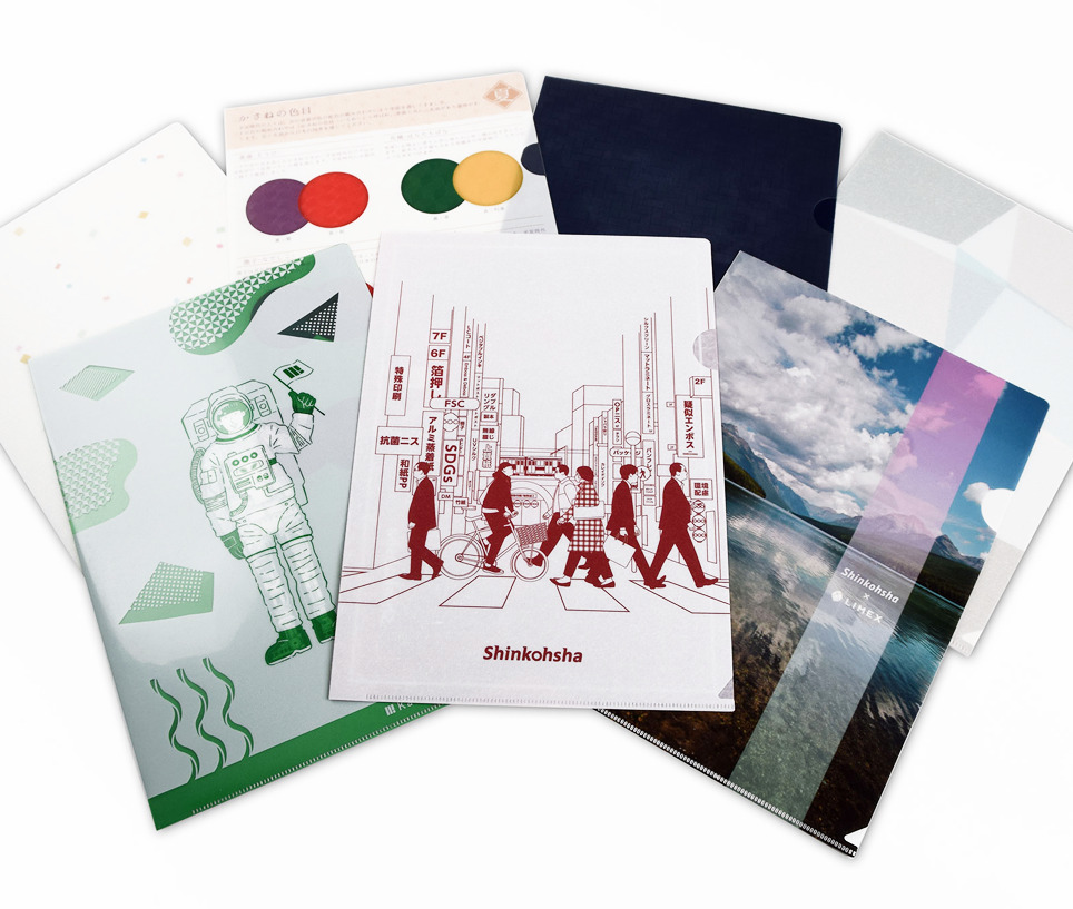 さらにクリアファイルに和紙PP、疑似エンボス、箔押しなど特殊加工を施すことで、高級感や特別感を演出することができます。クリアファイルの素材も再生PPやLIMEXなど環境に配慮した素材も取り揃えております。